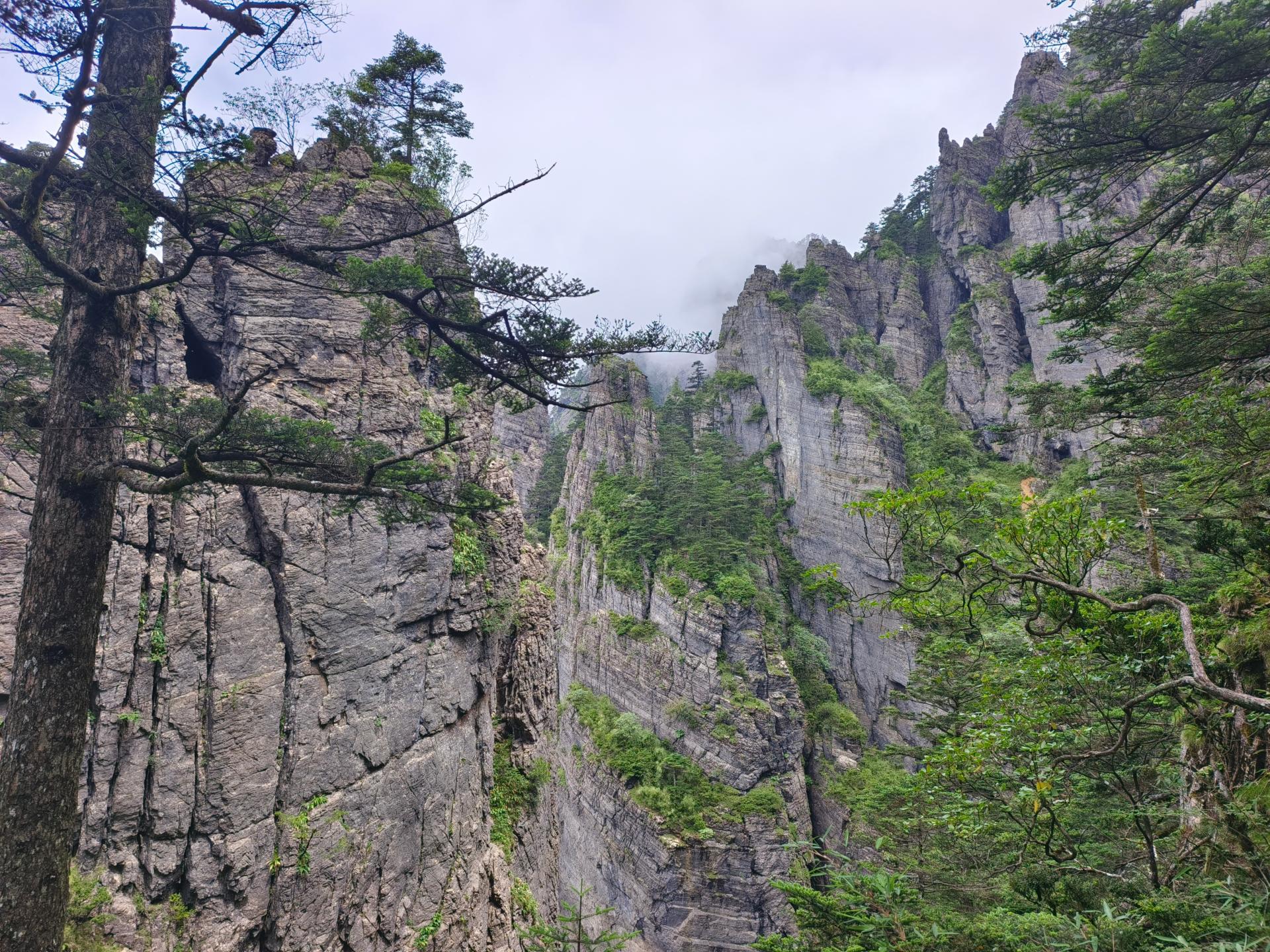 第二站步入神农顶,开始大约快四个小时的爬山之路,上坡又下坡,踏上一阶又一阶宛如天梯般被云雾缭绕的木梯,脚趾发软,双腿发颤,唯一的慰藉便是扶梯外偶尔显现的高耸入云的山巅,以及伴随丝绸般绵密的云雾吹拂到脸庞的阵阵凉风。